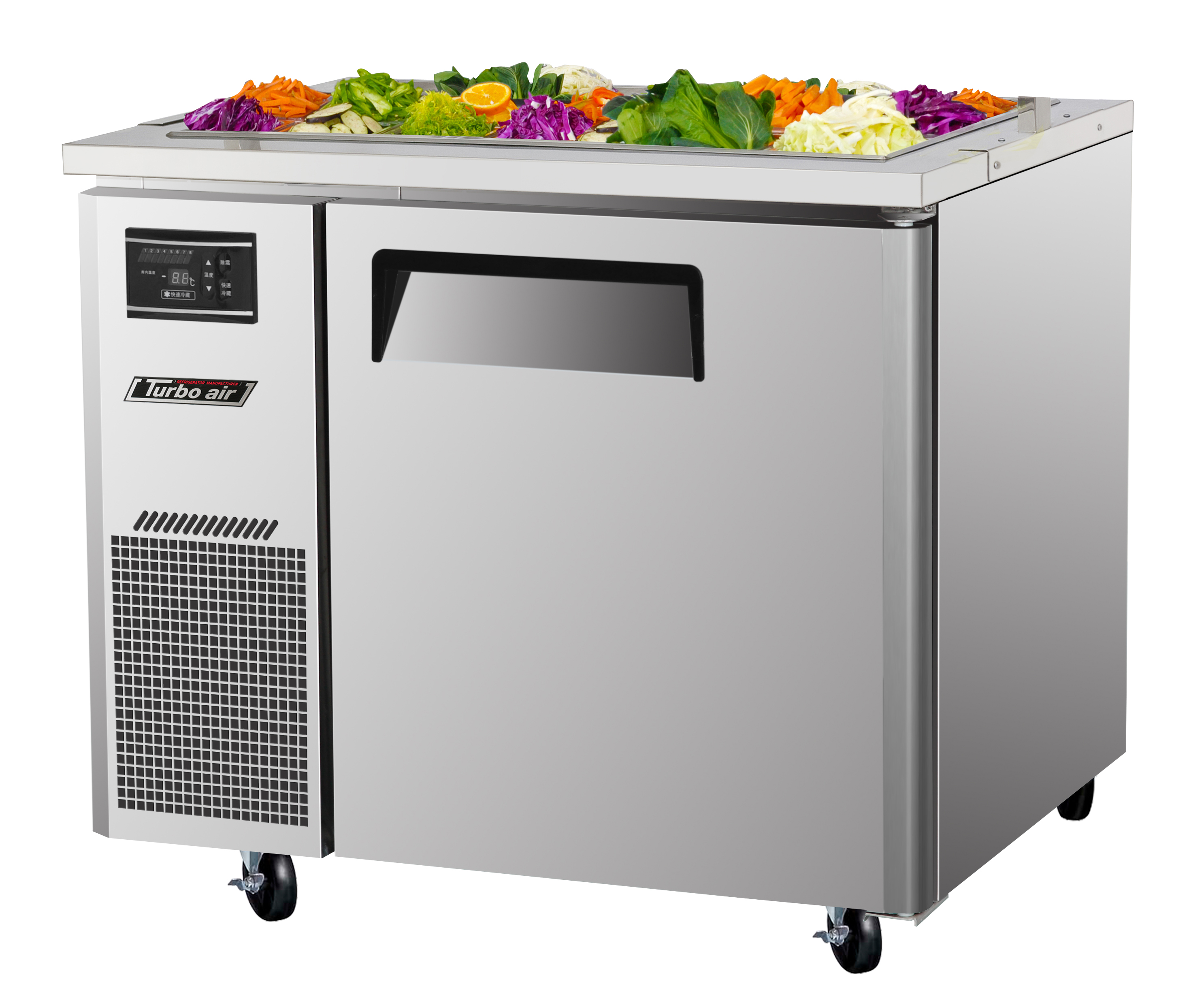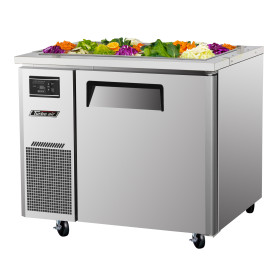 J Series Refrigerated Buffet Table-side mount, one section, 7.5 cu. ft., (1) stainless steel swing door with recessed handle, stainless steel top, front, sides & back, stainless steel interior floor with aluminum side panels & door liner, hot gas condensate system, (1) PE coated wire shelf, (6) 1/3 size condiment pans included, 4" dia. swivel casters, front breathing, self-contained, 1/4 HP, 115v/60/1, 6.6 amps, NEMA 5-15P, cETLus, ETL-Sanitation