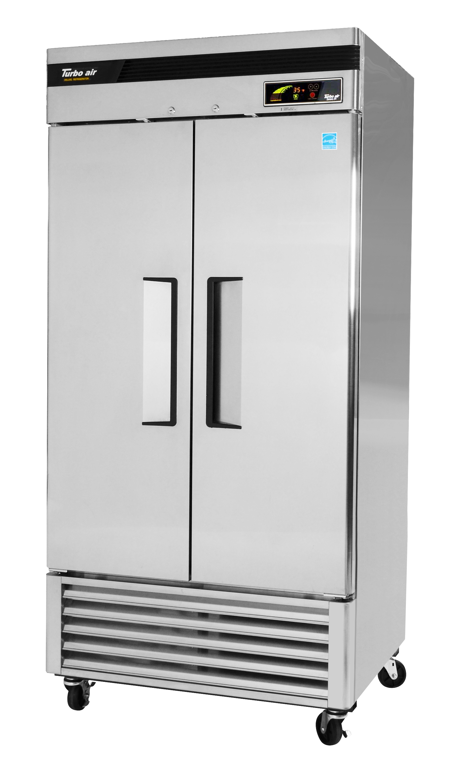 Super Deluxe Refrigerator, reach-in, two-section, 35 cu. ft., self-contained, stainless steel front & side, galvanized back & top of the cabinet, stainless steel interior, hinged solid door with recessed handle, (6) adjustable stainless steel wire shelves, exterior LED digital thermometer, door-open alarm beeps, self-diagnostic monitoring system, Turbo cooling, automatic fan motor delays, door pressure release device, LED interior lighting, self-cleaning condenser equipped, door locks, 4" dia. swivel casters, bottom mount compressor, 1/3 HP, 115v/60/1, 9.0 amps, NEMA 5-15P, NSF 7, cETLus