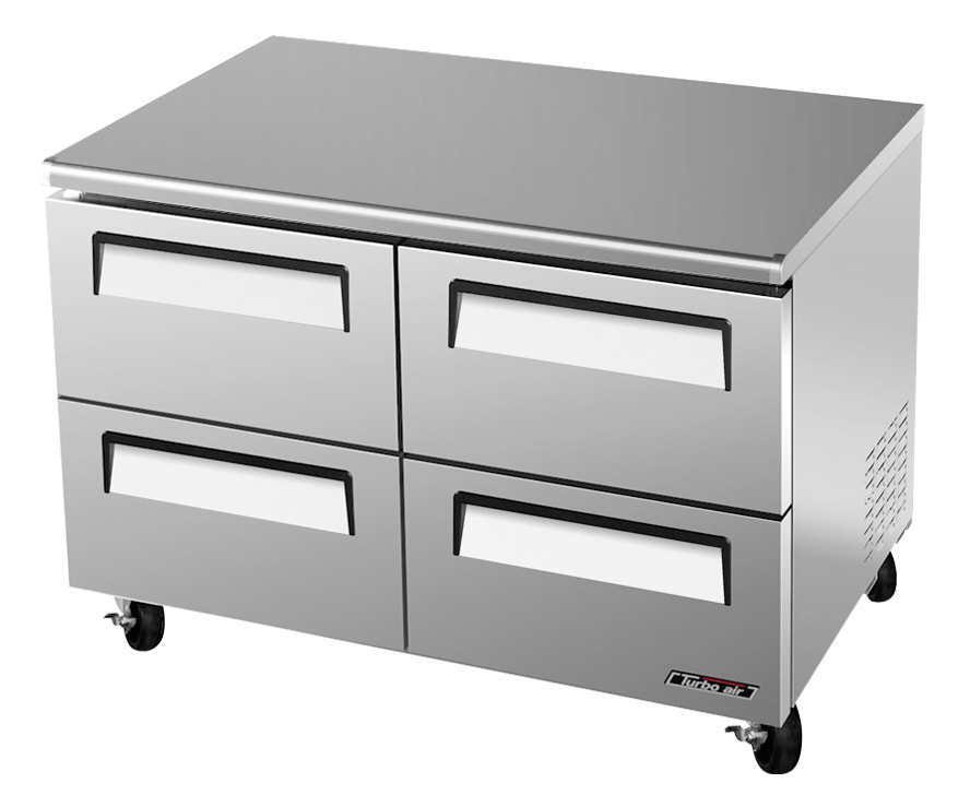 Super Deluxe Series Undercounter Refrigerator, two-section, 12 cu. ft., self-cleaning condenser equipped, stainless steel top, front & sides, (4) stainless steel drawers with recessed handles, stainless steel interior with ABS door liner, 4" casters, self-contained rear mount refrigeration system, 1/3 HP, 115v/60/1, 6.5 amps, NEMA 5-15P, cETLus, NSF 7