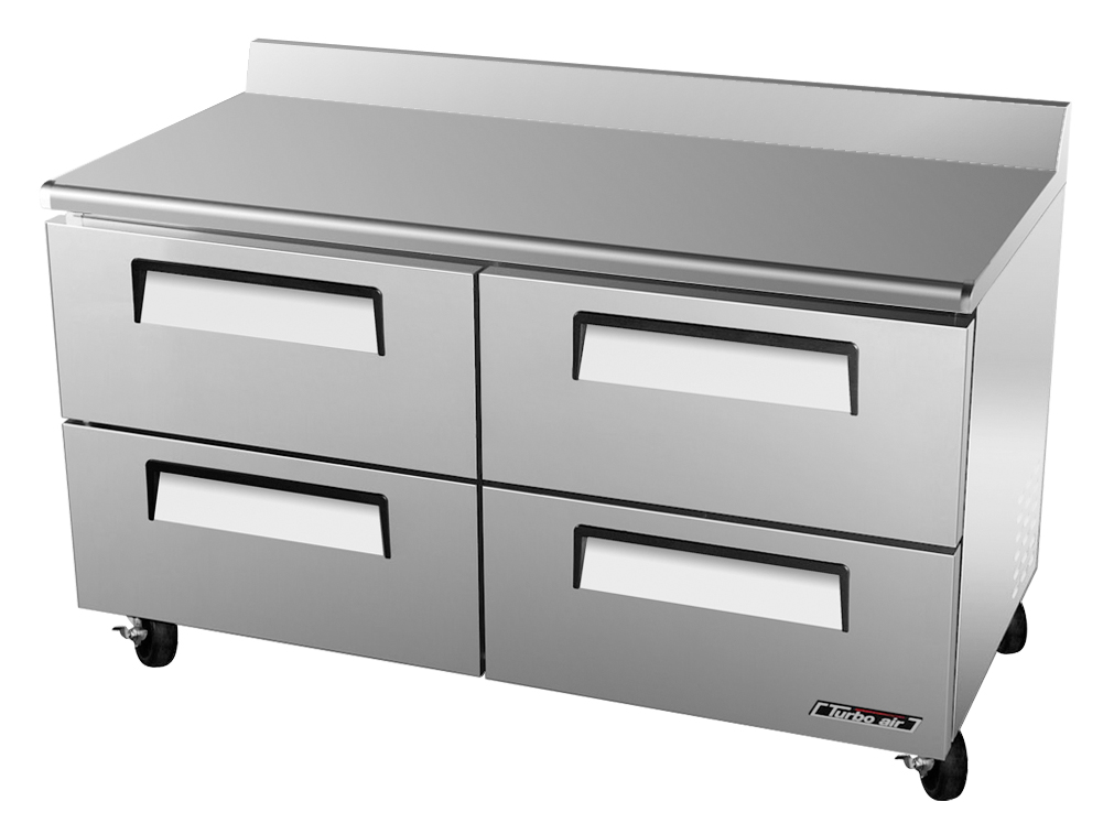 Super Deluxe Worktop Refrigerator, two-section, 16 cu. ft., self-cleaning condenser equipped, (4) stainless steel drawers with recessed handles, stainless steel interior & exterior, 4" casters, self-contained rear mounted refrigeration system, 1/3 HP, 115v/60/1, 9.9 amps, cord with NEMA 5-15P, cETLus, NSF