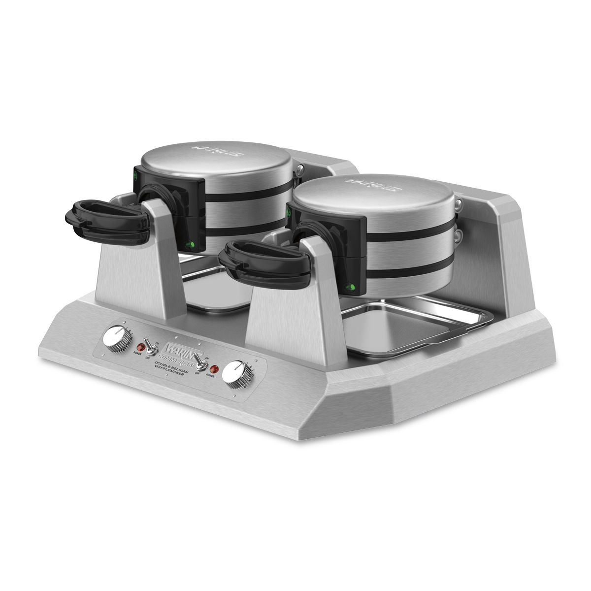 Make up to 120, 1" thick, golden-brown Belgian waffles per hour with the Waring® Side-By-Side Double Belgian Waffle Maker. It's perfect for diners, cafes, and any other foodservice establishment. Nonstick plates allow easy removal of waffles. Heavy-duty, die-cast housing, embedded heating elements and a rotary feature ensure even results and quick cleanup.