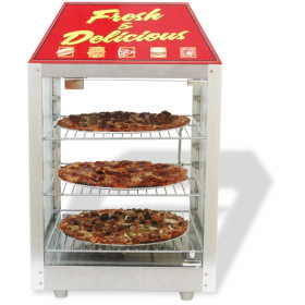 The adjustable thermostat and circulating fan make this unit ideal for any application. The three adjustable chrome-plated racks can be placed flat or sloped and are removable for easy cleaning. Attractive Graphics help to create impulse sales. Stainless Steel and Aluminum construction provides durability and ease of cleaning. This unit will hold up to a 12" pie.